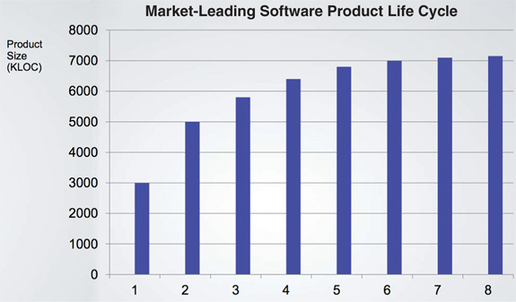 But now compare the curve in Figure 1.5 with the lines of code written per release in Figure 1.2. That initial few hundred thousand dollars per month bought a lot of functionality—but the final $20 million bought almost nothing! Any CFO would look at these two graphs and know that immediate action is necessary to stave off disaster.