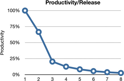 Figure 1.4 shows what this curve looks like to the developers. They started out at nearly 100% productivity, but with each release their productivity declined. By the fourth release, it was clear that their productivity was going to bottom out in an asymptotic approach to zero.