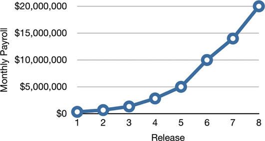 Release 1 was delivered with a monthly payroll of a few hundred thousand dollars. The second release cost a few hundred thousand more. By the eighth release monthly payroll was $20 million, and climbing.
