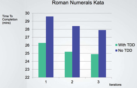 图 1-6: Time to completion by iterations and use/non-use of TDD