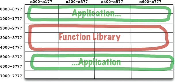 This worked fine so long as the application could fit between addresses 00008 and 17778. But soon applications grew to be larger than the space allotted for them. At that point, programmers had to split their applications into two address segments, jumping around the function library (Figure 12.2).