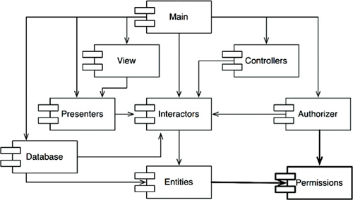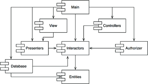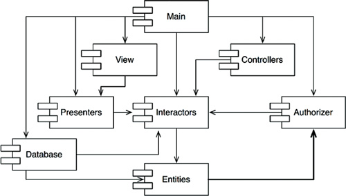 When it is time to release the whole system, the process proceeds from the bottom up. First the Entities component is compiled, tested, and released. Then the same is done for Database and Interactors. These components are followed by Presenters, View, Controllers, and then Authorizer. Main goes last. This process is very clear and easy to deal with. We know how to build the system because we understand the dependencies between its parts.
