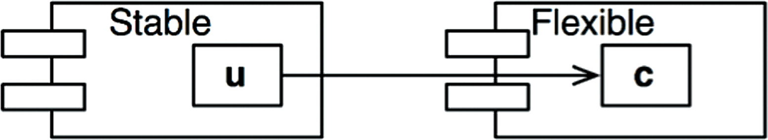 To fix this problem, we somehow have to break the dependence of Stable on Flexible. Why does this dependency exist? Let’s assume that there is a class C within Flexible that another class U within Stable needs to use (Figure 14.10).