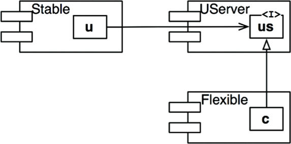 You may find it strange that we would create a component—in this example, UService—that contains nothing but an interface. Such a component contains no executable code! It turns out, however, that this is a very common, and necessary, tactic when using statically typed languages like Java and C#. These abstract components are very stable and, therefore, are ideal targets for less stable components to depend on.