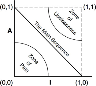 We are now in a position to define the relationship between stability (I) and abstractness (A). To do so, we create a graph with A on the vertical axis and I on the horizontal axis (Figure 14.12). If we plot the two “good” kinds of components on this graph, we will find the components that are maximally stable and abstract at the upper left at (0, 1). The components that are maximally unstable and concrete are at the lower right at (1, 0).