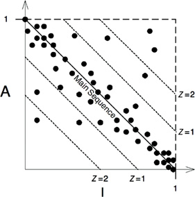 很明显,最多变的组件应该离上述两个区域越远越好。在图 14.13 中,我们可以将距离两个区域最远的点连成一条线,即从(1,0)连接到(0,1)。我将这条线称为主序列线(main sequence)。