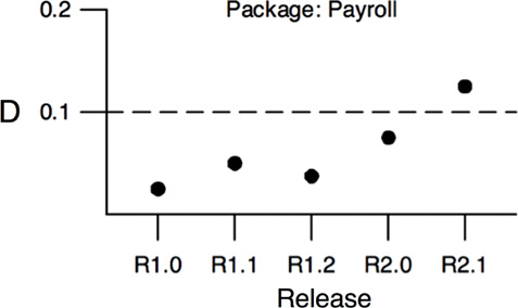 Another way to use the metrics is to plot the D metric of each component over time. The graph in Figure 14.15 is a mock-up of such a plot. You can see that some strange dependencies have been creeping into the Payroll component over the last few releases. The plot shows a control threshold at D = 0.1. The R2.1 point has exceeded this control limit, so it would be worth our while to find out why this component is so far from the main sequence.