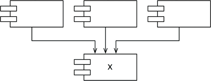 The diagram in Figure 14.5 shows X, which is a stable component. Three components depend on X, so it has three good reasons not to change. We say that X is responsible to those three components. Conversely, X depends on nothing, so it has no external influence to make it change. We say it is independent.