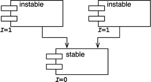 The changeable components are on top and depend on the stable component at the bottom. Putting the unstable components at the top of the diagram is a useful convention because any arrow that points up is violating the SDP (and, as we shall see later, the ADP).