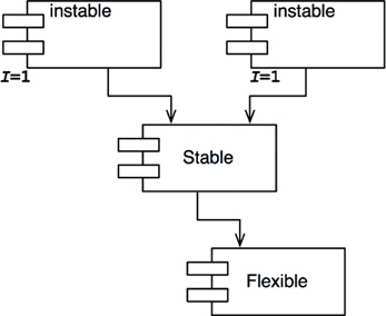 If all the components in a system were maximally stable, the system would be unchangeable. This is not a desirable situation. Indeed, we want to design our component structure so that some components are unstable and some are stable. The diagram in Figure 14.8 shows an ideal configuration for a system with three components.