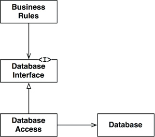 But, as we shall see in another chapter, this idea is misguided. The database is a tool that the business rules can use indirectly. The business rules don’t need to know about the schema, or the query language, or any of the other details about the database. All the business rules need to know is that there is a set of functions that can be used to fetch or save data. This allows us to put the database behind an interface.