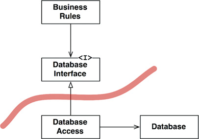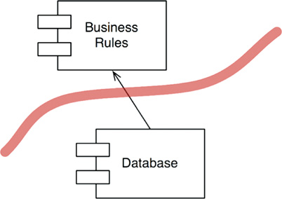 Having drawn this boundary line between the two components, and having set the direction of the arrow toward the BusinessRules, we can now see that the BusinessRules could use any kind of database. The Database component could be replaced with many different implementations—the BusinessRules don’t care.