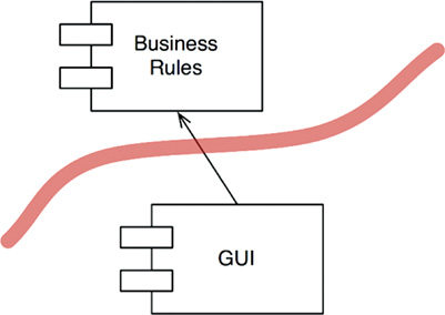 And so, once again, we see the GUI and BusinessRules components separated by a boundary line (Figure 17.4). Once again, we see that the less relevant component depends on the more relevant component. The arrows show which component knows about the other and, therefore, which component cares about the other. The GUI cares about the BusinessRules.