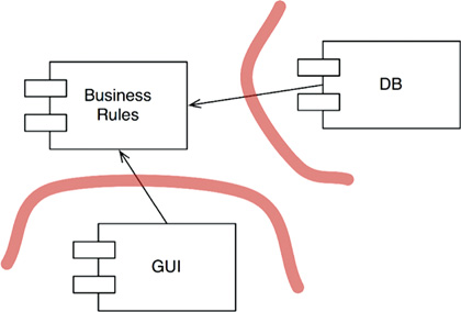 如果读者对上面这段话感到困惑,请记住一点,Database 组件中包含了将 BusinessRules 组件中的函数调用转化为具体数据库查询语言的代码。这些转换代码当然必须知道 BusinessRules 组件的存在。