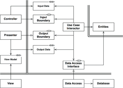 For example, suppose the use case needs to call the presenter. This call must not be direct because that would violate the Dependency Rule: No name in an outer circle can be mentioned by an inner circle. So we have the use case call an interface (shown in Figure 22.1 as “use case output port”) in the inner circle, and have the presenter in the outer circle implement it.