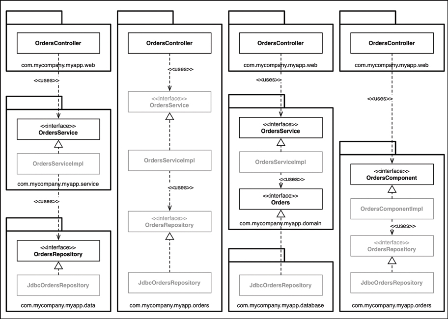 Moving from left to right, in the “package by layer” approach, the OrdersService and OrdersRepository interfaces need to be public, because they have inbound dependencies from classes outside of their defining package. In contrast, the implementation classes (OrdersServiceImpl and JdbcOrdersRepository) can be made more restrictive (package protected). Nobody needs to know about them; they are an implementation detail.