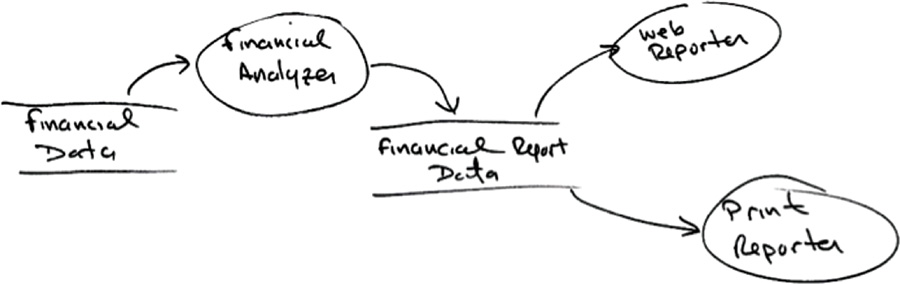 By applying the SRP, we might come up with the data-flow view shown in Figure 8.1. Some analysis procedure inspects the financial data and produces reportable data, which is then formatted appropriately by the two reporter processes.