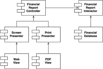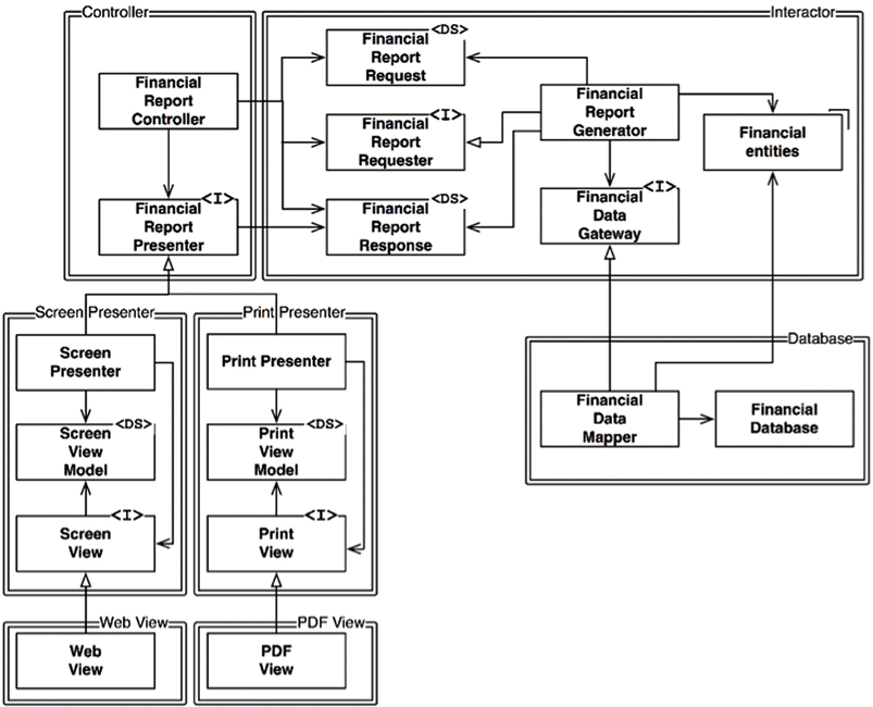 For example, the FinancialDataGateway interface between the FinancialReportGenerator and the FinancialDataMapper exists to invert the dependency that would otherwise have pointed from the Interactor component to the Database component. The same is true of the FinancialReportPresenter interface, and the two View interfaces.